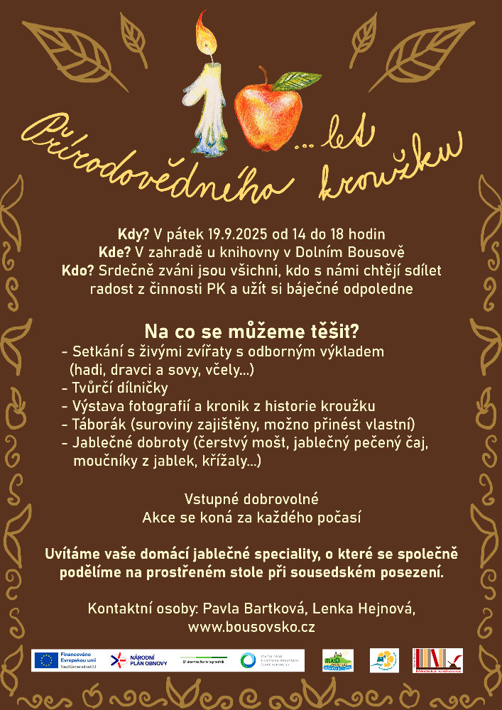 Těšíme se s vámi na první společnou schůzku v novém školním roce. Uskuteční se 26.9.2023 ve 13 hodin, sraz je před školou. Také vás zveme na oslavy 10 let existence Přírodovědného kroužku v Dolním Bousově.